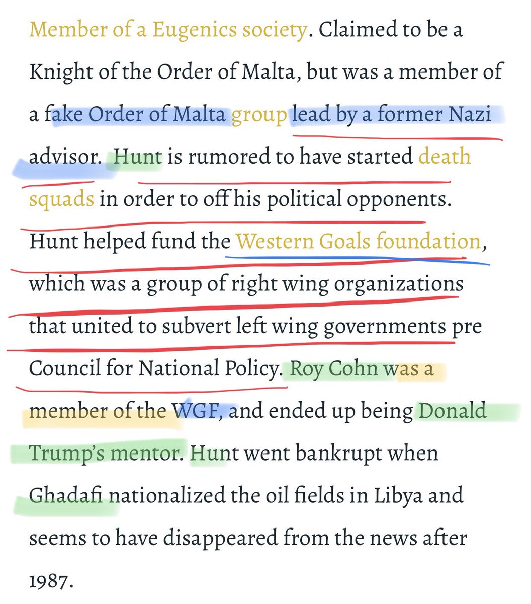 🔥NelsonBunker Hunt was on Board of Governors of CNP and funded the WGF - Western Goals Foundation that Trump’s Mentor Roy Cohn belonged to. He also created DEATH SQUADS to kill political opponents‼️These are the types of people Bannon, Sekulow, Conway, DeVos hang out w at CNP‼️