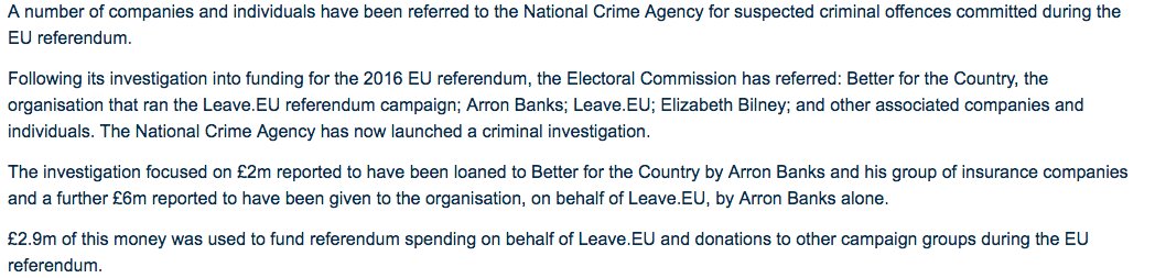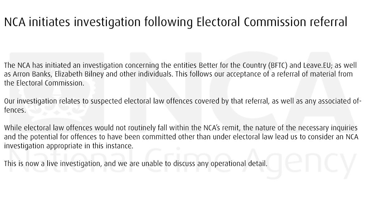 Leave .EU and Arron Banks have been referred to the National Crime Agency – and "The National Crime Agency has now launched a criminal investigation"