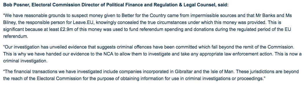 “We have reasonable grounds to suspect money given to Better for the Country came from impermissible sources and that Mr Banks and Ms Bilney, the responsible person for Leave .EU, knowingly concealed the true circumstances under which this money was provided."