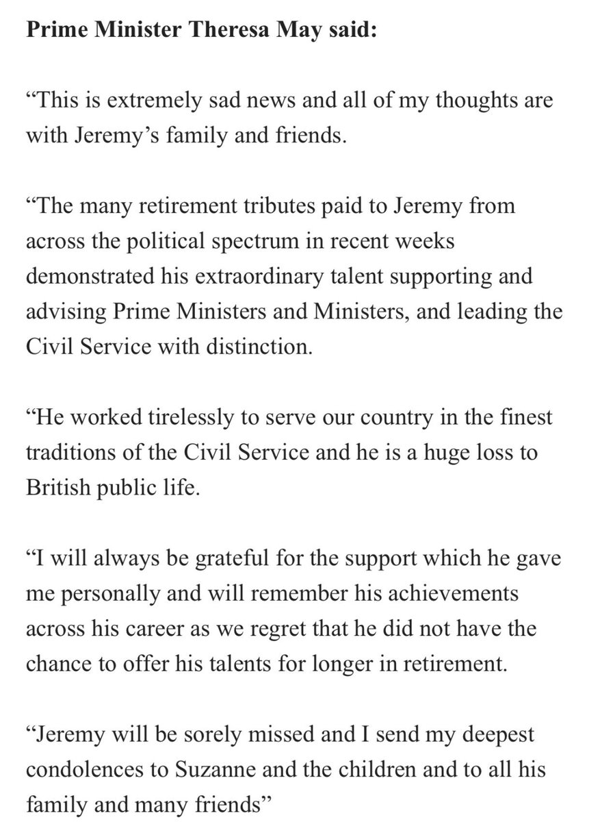 PM’s tribute to Lord Heywood former Cabinet Secretary who has died from cancer aged 56. “He worked tirelessly to serve our country”
