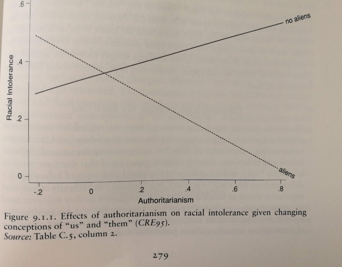 @Hegghammer Too bad they turned back. This graph by @karen_stenner suggests we could use some aliens right now. "Among those learning that NASA has verified the existence of alien life forms, authoritarianism decreases racial intolerance by nearly half the range of the dependent variable"