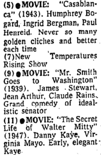 11/6/73 at 8 pm. Something I've never seen, three stone classics going head-to-head in prime time on all three of NYC's independent VHF stations. It was Election Night, and WOR offered THE LAST HURRAH at 11 pm for a chaser.