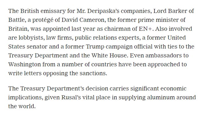 @NYT @kenvogel So first they start by implicating a British leader, Lord Barker of Battle from the UK's Conservative Party. Also a protege of former Prime Minister David Cameron. Cameron is now the Chairman of Deripaska's firm EN+. This Russian Collusion to avoid sanctions is pretty clear.