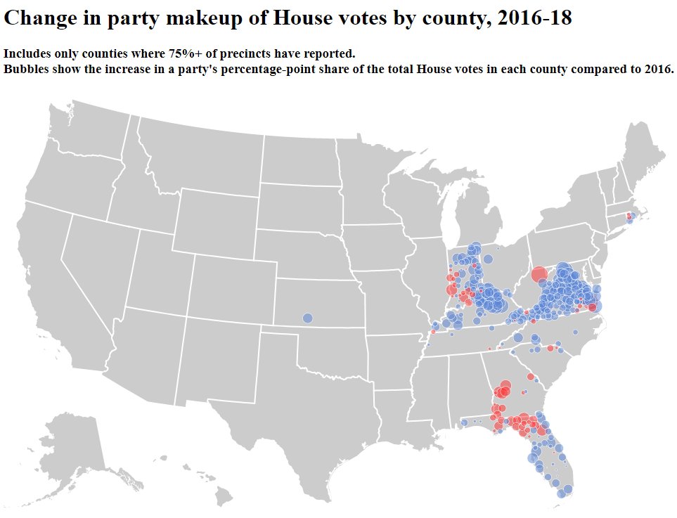 Again, early. But in most of the counties where we're seeing 75% of precincts reporting, there's been a not-small shift toward the Democratic candidates in House races, compared to 2016.