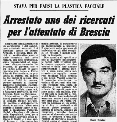 Tempo dopo furono arrestati Italo Dorini e Giuseppe Piccini, delinquenti comuni dediti a furti, rapine e azioni violente alla bisogna quando chiamava l’eversione nera. Autori, nel frattempo, anche dell'omicidio del brigadiere Lorenzo Forleo.