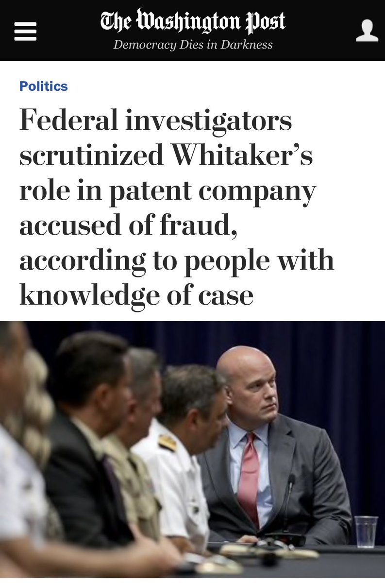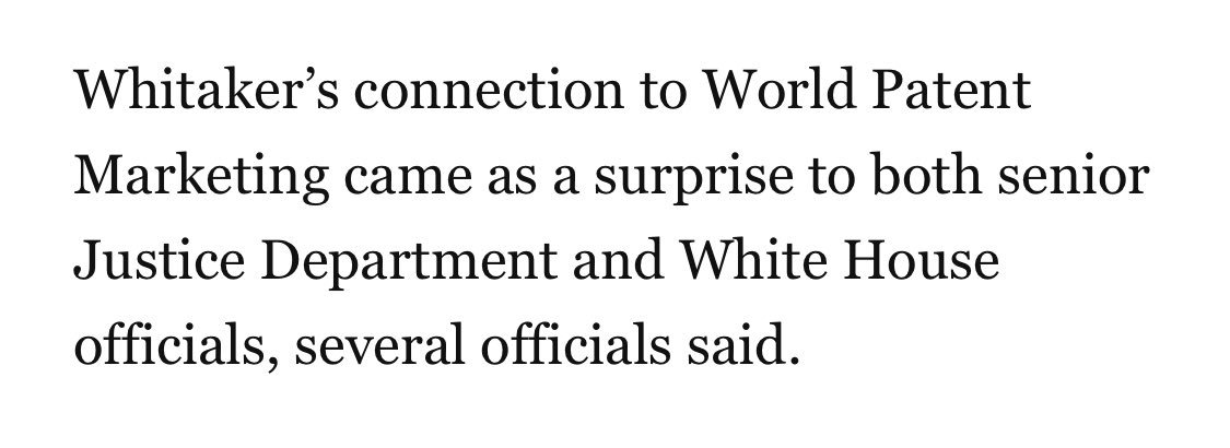 An FBI investigation into Whitaker-linked World Patent Marketing — which we discussed on the day Whitaker was named acting AG — remains ongoing to this day, WSJ reports —> wsj.com/articles/fbi-i…