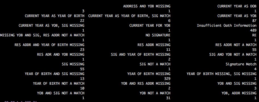 Hard to tell how many due to birth year. About half are 'insufficient oath information,' which could include birth year. 285 are explicitly 'yob missing'