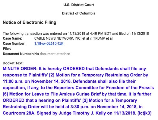 JUST IN: Judge orders the Trump administration to respond to CNN's TRO request by 11a Wednesday. Hearing set for 3:30p Wednesday.