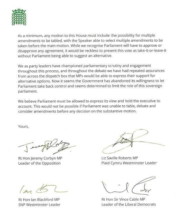 Meanwhile Opposition Parties join together to sign letter to PM demanding that Commons has right to make amendments to meaningful vote motion on Brexit Deal in advance of main vote, unlike Raab proposals