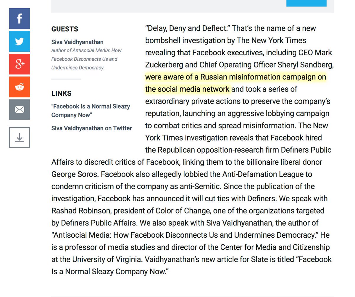 There's an awkward omission underpinning virtually everyone's (to illustrate, even @democracynow ) coverage of NYT Facebook story: no one details the "Russian misinformation campaign" that FB supposedly hid. Why? Cause it was juvenile clickbait trash mostly unrelated to election.