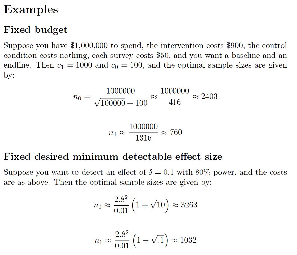 2. With desired effect size delta & power beta: n(~T)*=t_MDE^2/delta^2 *(1+sqrt(c(T)/c(~T))); n(T)*=t_MDE^2/delta^2 *(1+sqrt(c(~T) /c(T))), where t_MDE=t_{alpha/2}+t_beta