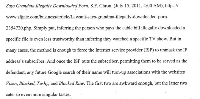 Basically, this company gets the IP of a user who uses Bittorrent to get copyrighted porn. The company sues, and asks the court to order the internet service provider to identify the user. The judge notes there are a lot of problems with this approach