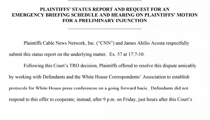 So given the White House's letter to Acosta on Friday, CNN is asking the judge to set an expedited schedule for briefing and a hearing on the preliminary injunction motion