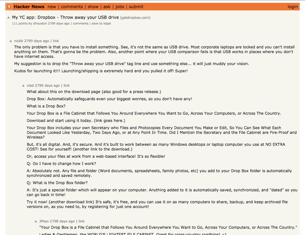 - tourne une vidéo de démo intitulée « My YC app: Dropbox – Throw away your USB drive » avec un formulaire pour s'inscrire sur la liste d'attente de la version bêta