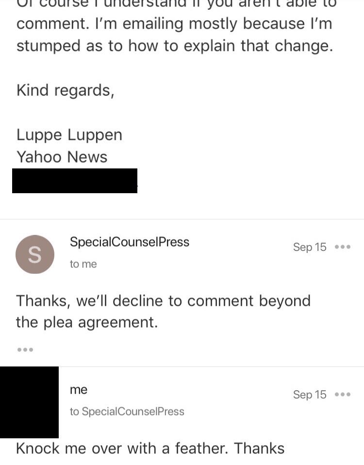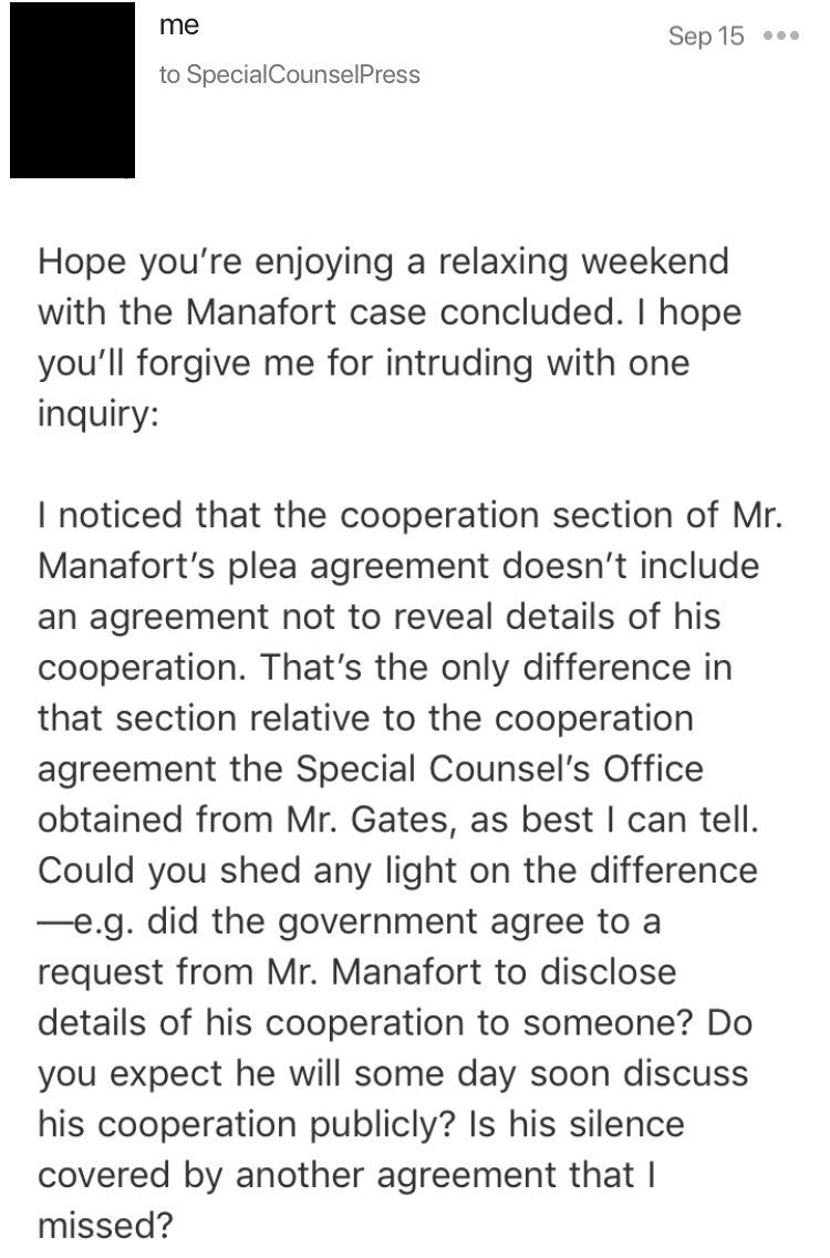 As to the larger story of Downing briefing Trump’s lawyers, remember that someone specifically negotiated to remove this provision of Gates’s plea agreement from Manafort’s—a difference pointed out in my old dumb spreadsheet comparing the plea agreements. docs.google.com/spreadsheets/d…