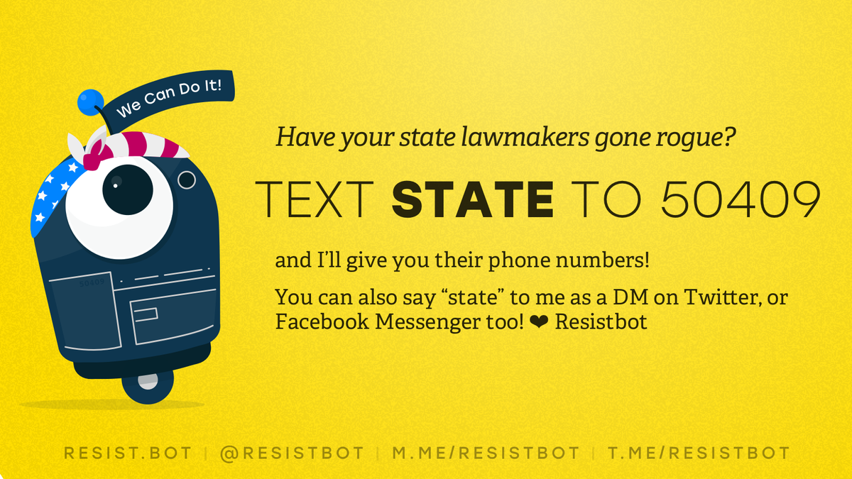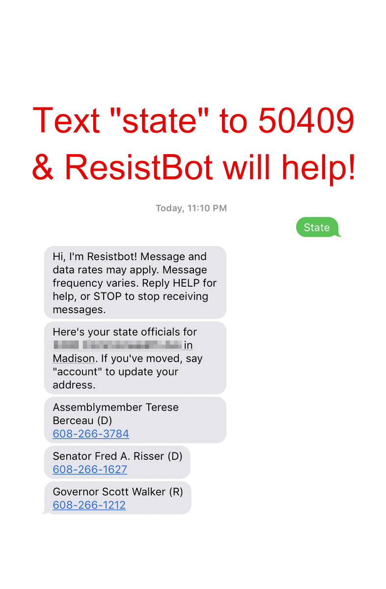NEW! The @ResistBot wizards have just launched the PERFECT tool for this moment: text "state" to 50409—and it'll tell you the phone numbers for your state legislators. Or just DM "state" to @ResistBot. Wisconsinites, Michiganders: YOU NEED THIS NOW. Spread the word!