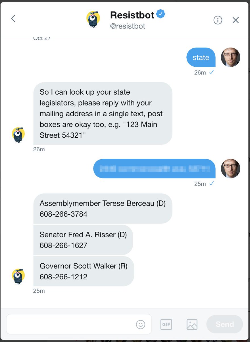 Want to know the phone numbers for your state legislators and governor? Just slide on in to @resistbot's DMs. Your opening line: "state"—and then your address. Boom. Phone numbers galore. Now call and use your constituent power to, oh, say, fight a hideous partisan power grab.