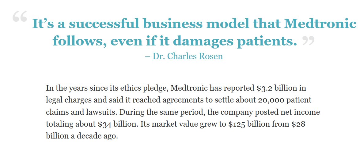 1 Thread Un article fouillé difficile à résumer en qqs mots sur un géant des dispositifs médicaux Medtronics, et ses méthodes, immorales et tragiquement nuisibles pour les patients mais hautement rentables icij.org/investigations…