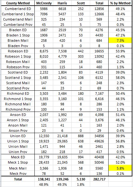 So this is pretty weird. McCrory won Bladen County 52%-46%. But he lost absentee by-mail in Bladen 61%-38%. The only voting method he lost in the county. McCrory also won statewide absentee by-mail voting in 2016. Hmm. 🤔 Seems like more ?s to be asked. #NC09 #NCPOL