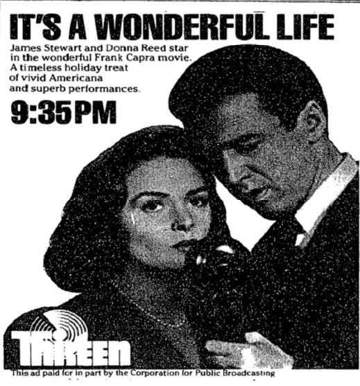 12/7/83 at 9:35 pm on WNET. NY TV debut 4/7/56 on WCBS' "The Late Show.'' Stewart said in a 1957 he felt Capra's classic worked better on TV than it did on a big screen. lumenick.com/james-stewart-… Copyright expired 1974, rescued from public domain in 1993. lumenick.com/25-years-ago-t…