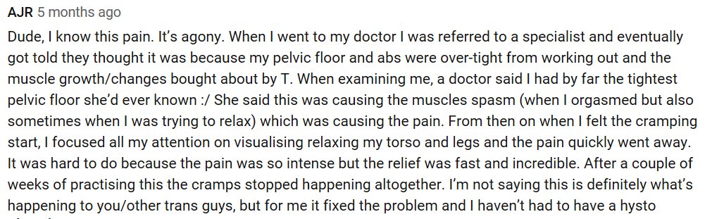 "He started talking to me about how many other men [sic] he's talked to about this issue. I had only opened up to 3, 4 trans friends and they all told me they had their own versions, some just random pain, some cramping hours or a day after an orgasm."