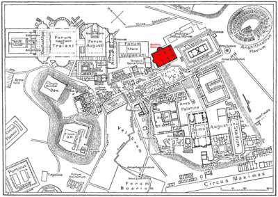 También amplia el palacio imperial del Palatino y abandona la Domus Aurea. La nueva Domus Flavia es un espacio donde el emperador recibe visitas, situado en el ábside. También se encuentran una sala de banquetes y un peristilo con una fuente oval. También edifica el Stadium.