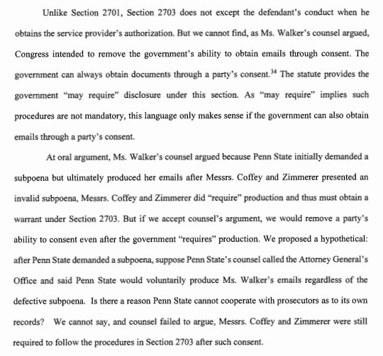 Odd Stored Communications Act ruling in a case about obtaining a university employee's e-mail from the university w/ an invalid subpoena. Held: No SCA violation b/c the university consented to the disclosure, & there must be a consent exception. (Thread.) orinkerrblog.files.wordpress.com/2018/12/Walker…
