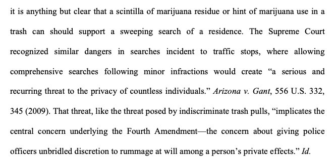I assume the opinion formally should be read as just suggesting that courts should be extra skeptical about trash pulls as the basis for PC, but at times the opinion seems to veer into the idea that searching a home is so invasive that a mere trash pull shouldn't be enough. /1