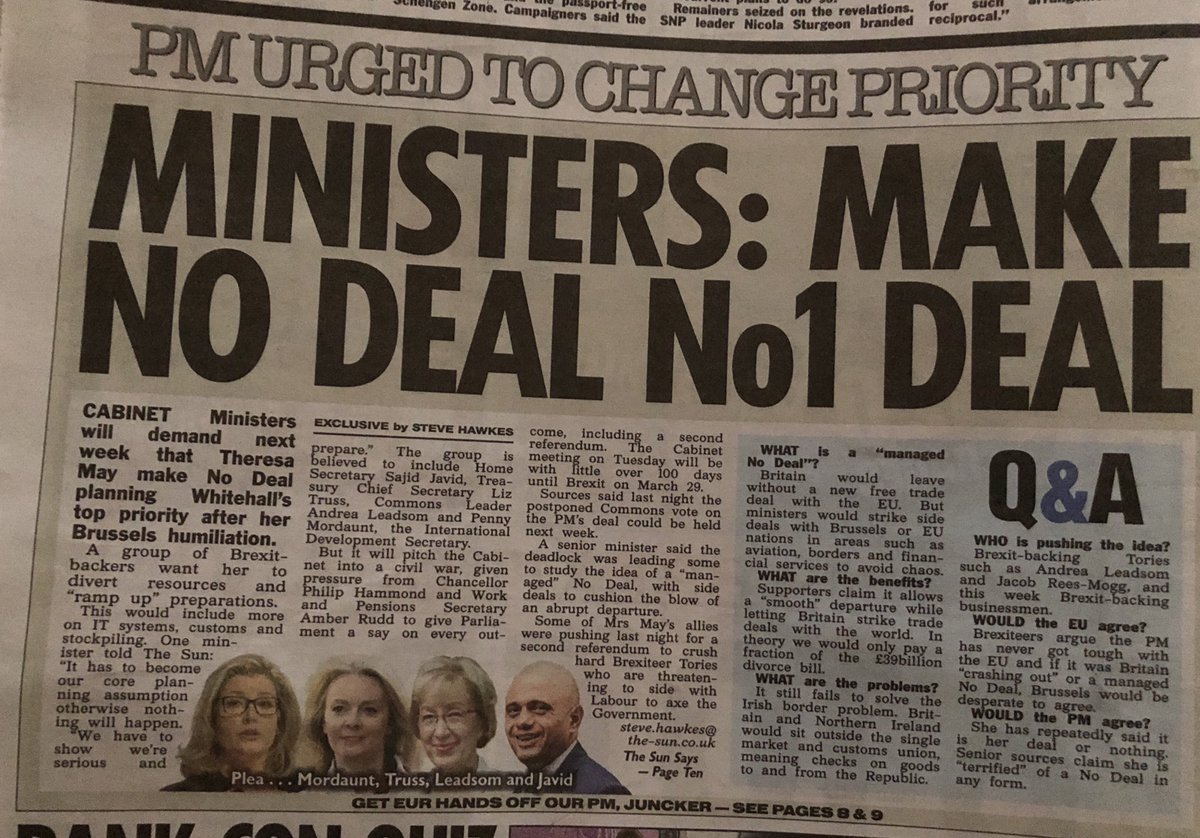 But the flaw in @AmberRuddHR’s argument is that the cabinet cannot even agree among themselves about best way forward for Brexit. She says no way to no-deal Brexit. As this from @TheSun shows, perhaps a third of her cabinet colleagues want no-deal embraced not spurned