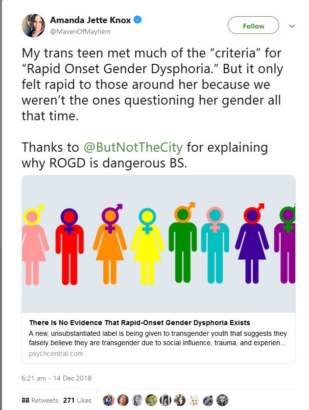 For someone who insists the "lived experience" of herself and her family are not to be questioned in any way, she has an odd penchant for invalidating the lived experience of parents, desisters, and detransitioners who have, in fact, been impacted by #ROGD .