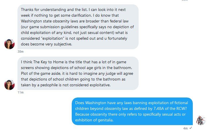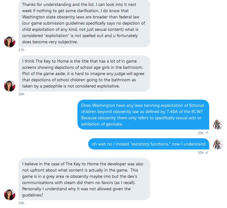 The Valve employee further confirms the ban on child exploitation and comments on the Key to Home ban. She claims that the ban on "child exploitation" in games without sexual content is due to Washington state obscenity law, not Valve's own discretion.