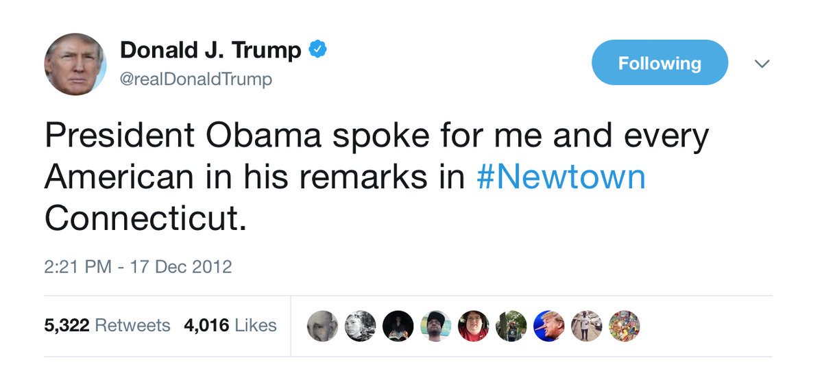 Obama's words to the families of Sandy Hook elementary - on this day in 2012 - touched his successor; @RealDonaldTrump took millions from the NRA and has protected its agenda - yet also spoke (after the Feb. 2018 Fla. school massacre) of stiffer laws. But nothing happened