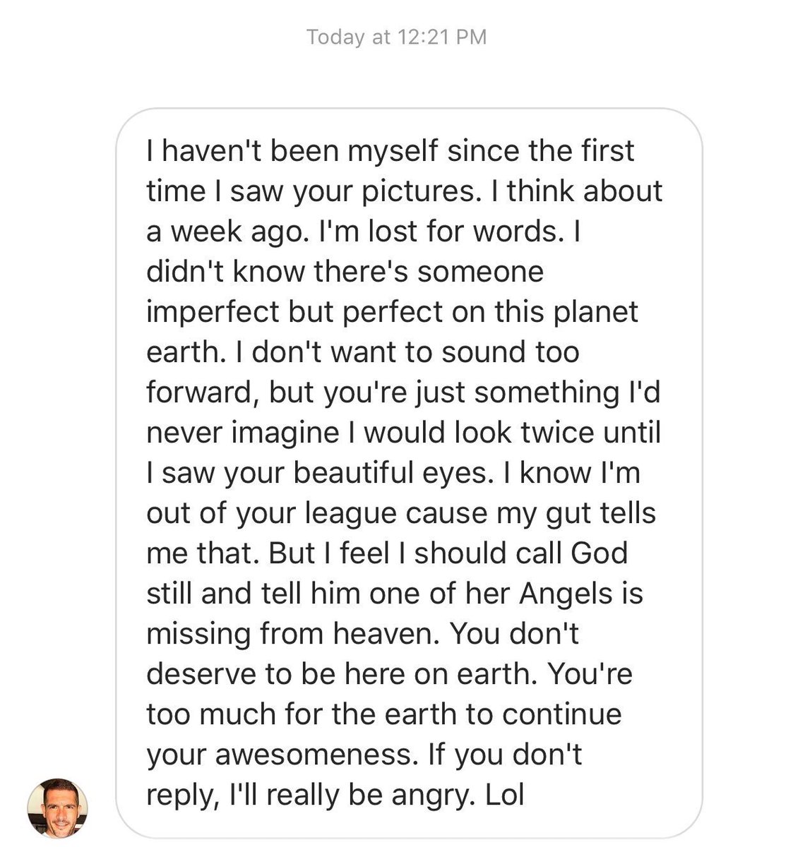 (It was sent to my Instagram message request folder; “These messages are from people you don’t follow. They’ll only know you’ve seen their request if you choose Allow.”)