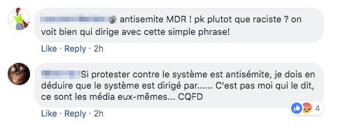 Depuis que la question de l'antisémitisme a été mis sur la table par les médias, ça dérape complètement et les antisémites sortent du bois sur les groupes FB. C'est très facile à avancer : si on vous traite d'antisémites, c'est bien parce que les juifs contrôlent le système.