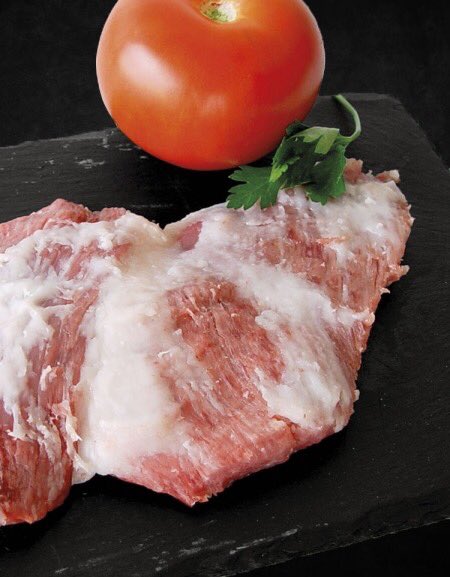 Al taglio si presenta come una fettina di spessore variabile tra i pochi mm ed il cm. Ma la caratteristica principale sono gli strati di grasso che lo coprono quasi uniformemente sia sopra che sotto.