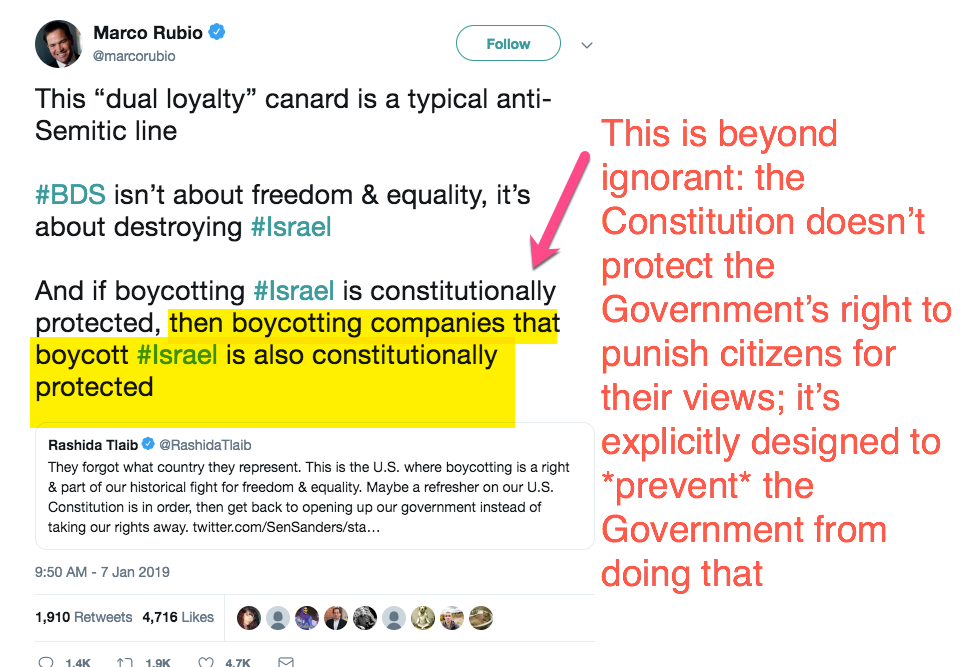 Also: @marcorubio's tweet is stunningly ignorant. He thinks the 1st Amendment protects the right of *the Government* to punish private citizens for their speech. It does the opposite: it protects the rights of private citizens not to be punished for their views by @MarcoRubio