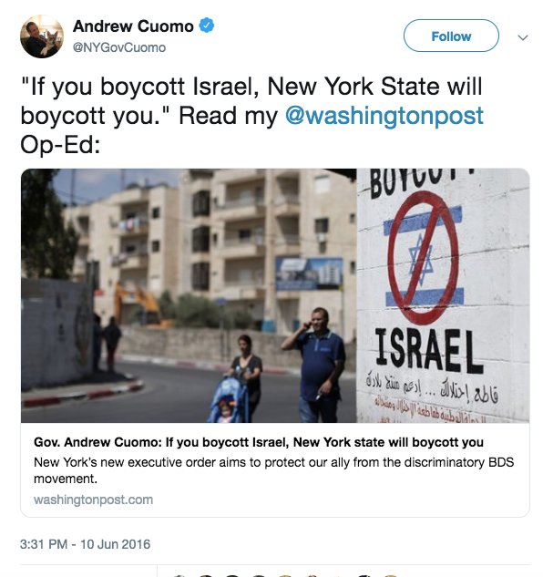 Remember that Andrew Cuomo supports the same bill that Marco Rubio supports: punishment for those who boycott Israel. But the same Andrew Cuomo ordered a boycott of 2 American states: North Carolina & Indiana. That's how warped this censorship scheme is by *U.S.* politicians:
