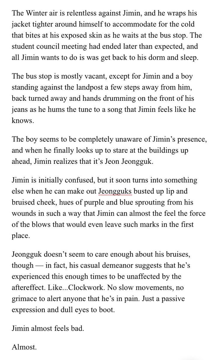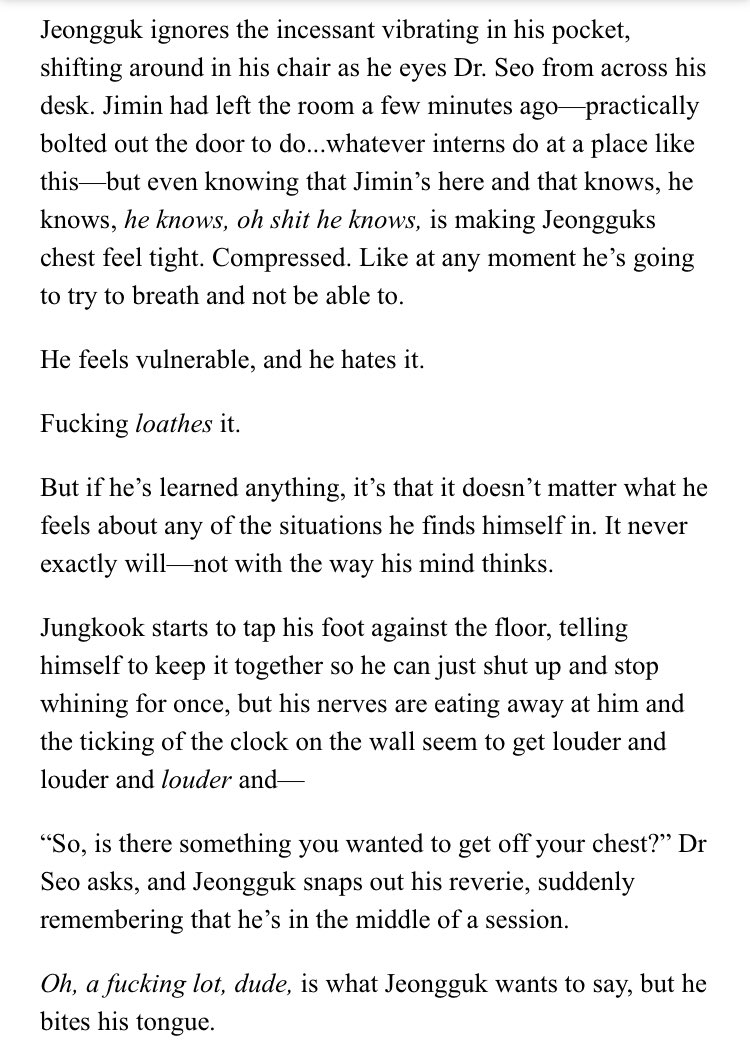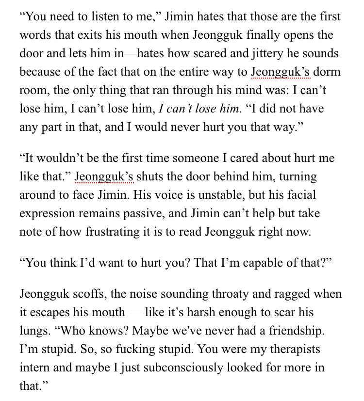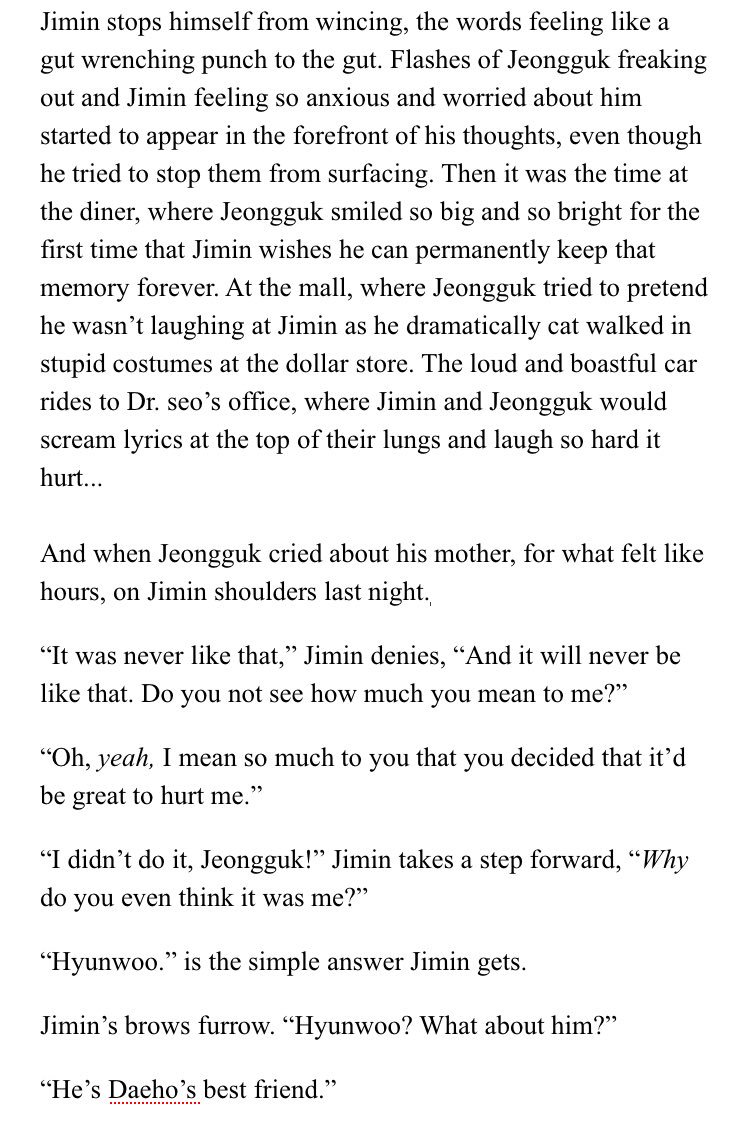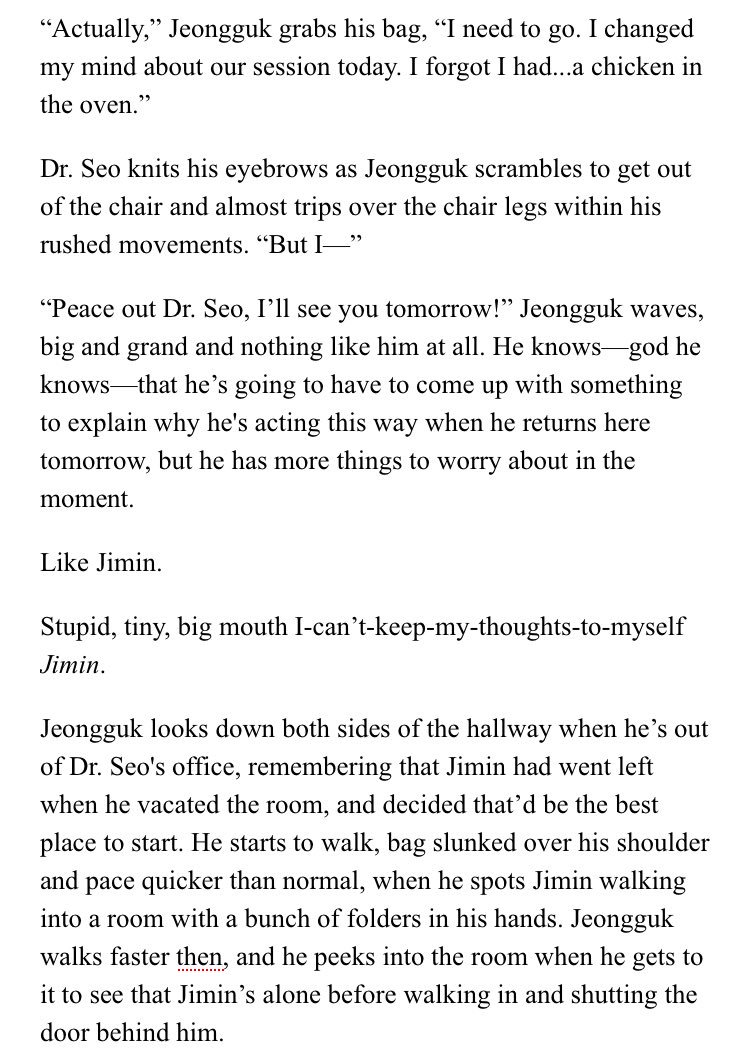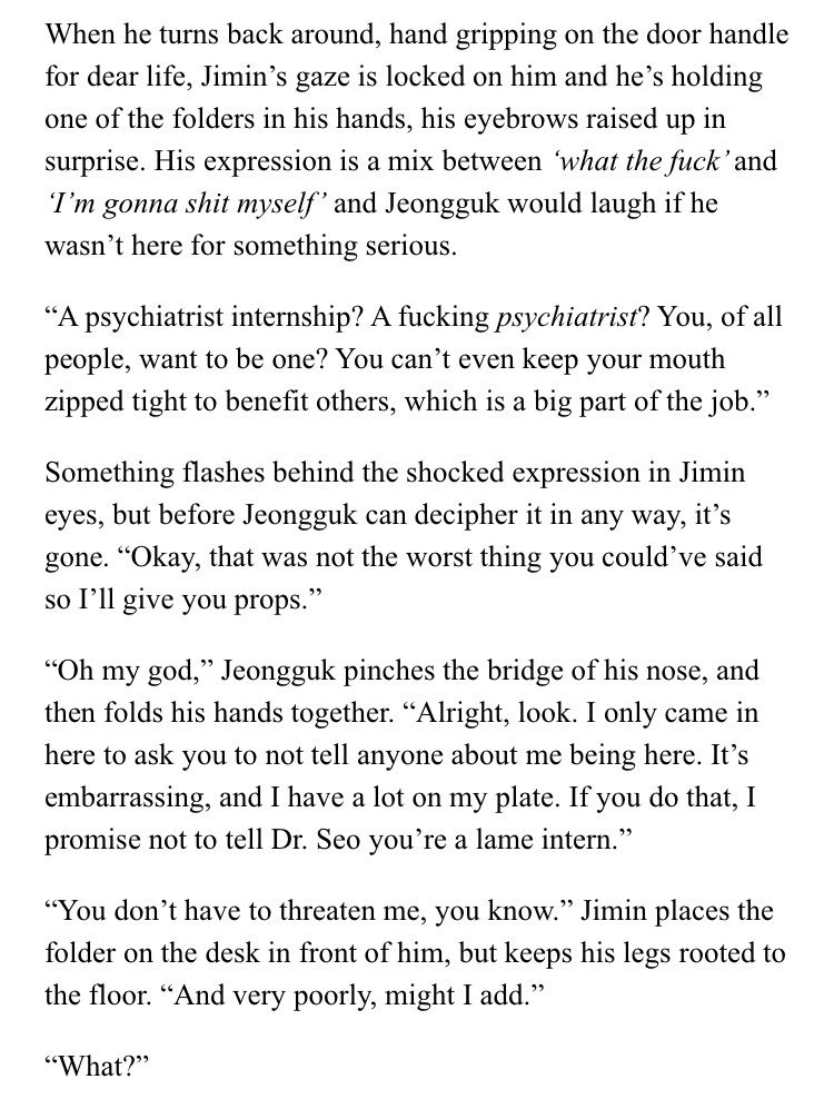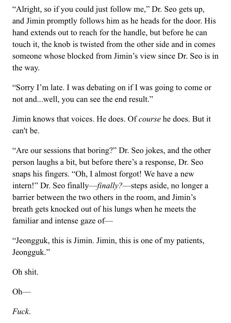 β Jimin's an aspiring psychology student at SNU. Jeongguk is the campusβ player & bad boy. After accepting an internship at a therapists office, Jimin discovers something about Jeongguk that no one else seems to know.