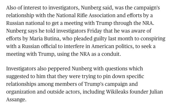 Also of interest to investigators, Nunberg said, was the campaign's relationship with the NRA and efforts by a Russian national to get a meeting with Trump through the NRA. Nunberg told investigators that he was aware of efforts by Maria Butina to seek a meeting with Trump.