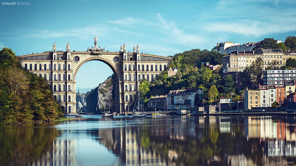 Unbuilt Britain shows interesting projects that were never built, like this 1793 idea for Bristol, by the architect William Bridges. The proposal followed the well known and effective ancient solution of making public infrastructure pay for itself, by rents, tolls, etc.