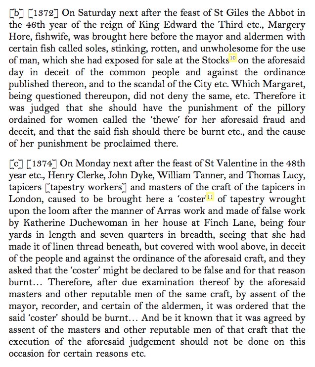 Medieval women cheated in the market and in the workshop just like medieval men did, and they were punished for it as well. Interesting example of a fishmonger selling rotten goods, and a weaver who nearly managed to fake a tapestry (maybe to save on materials, or labor)?