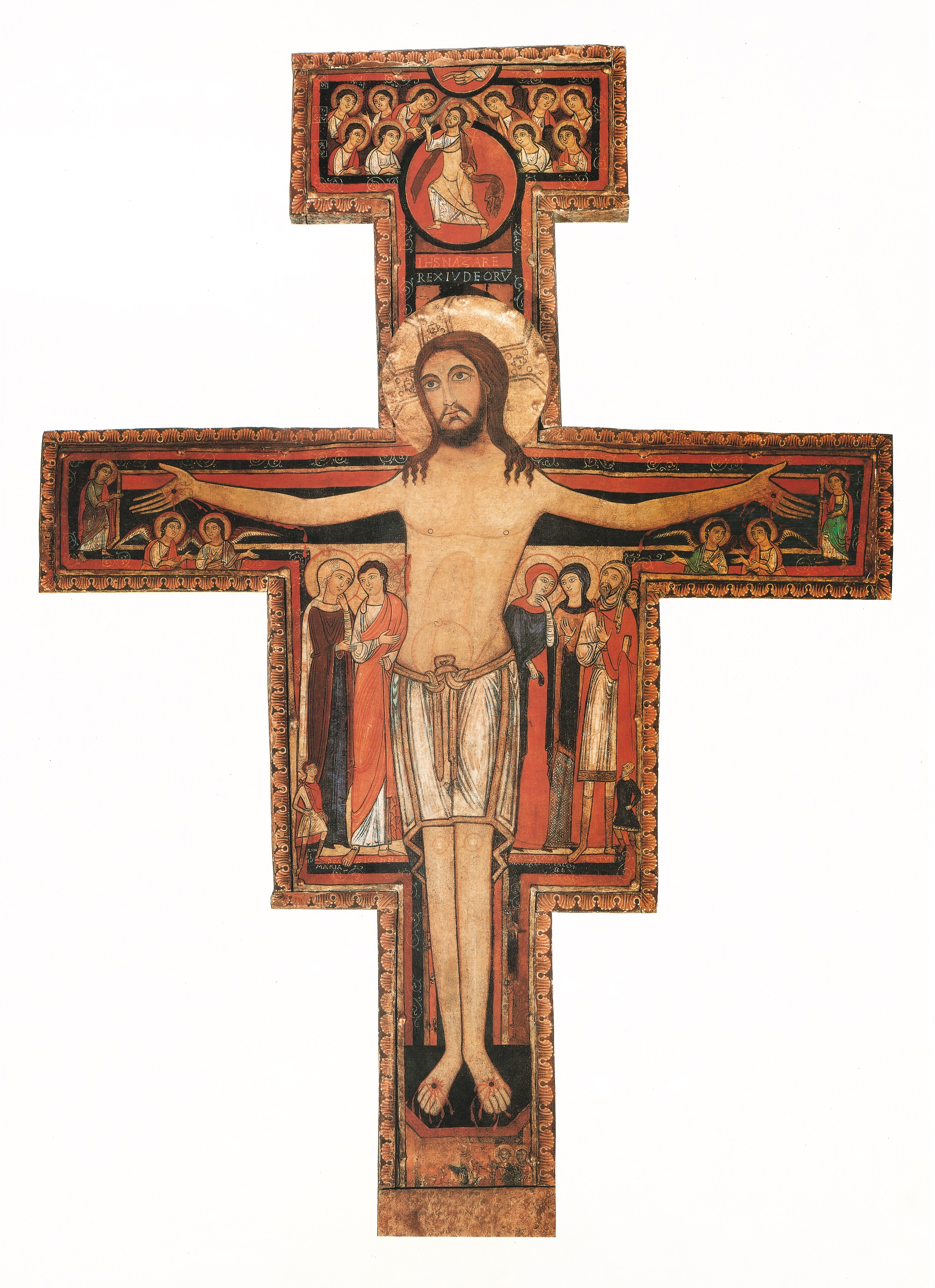 Y abajo el letrero con la frase: “Iesus Nazarenus Rex Iudeorum”, “Jesús, Nazareno, el Rey de los judíos”, que nos remite directamente al evangelio según San Juan.