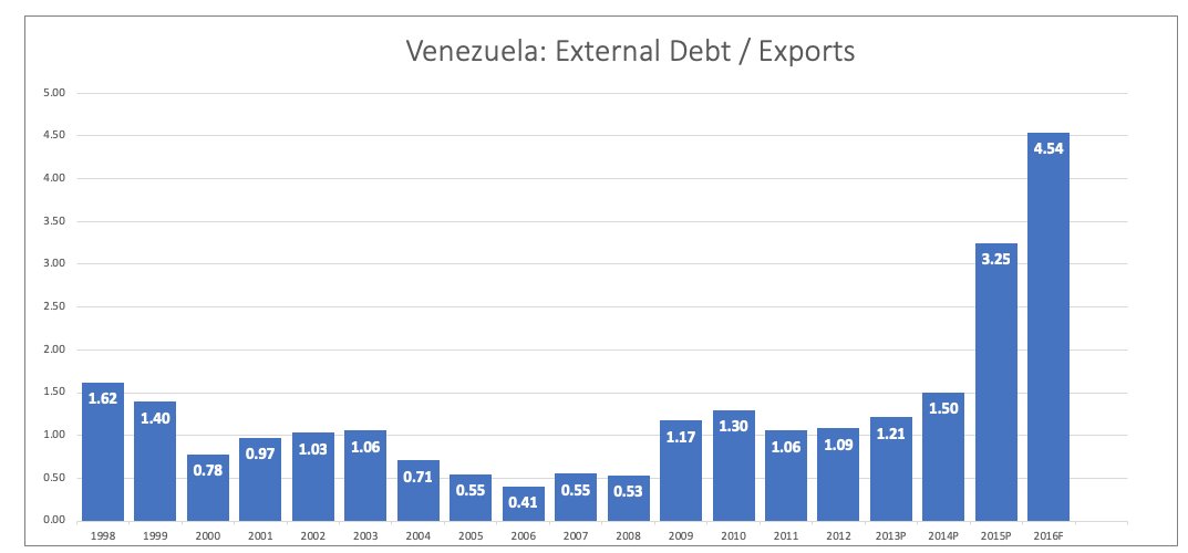@BootsRiley 11/ As it happened many times in many countries, when things are good (price of oil is high) you borrow more money. And so they did. Borrowed and borrowed, and the external debt of the country exploded. This is the external debt in terms of exports. See how it exploded.