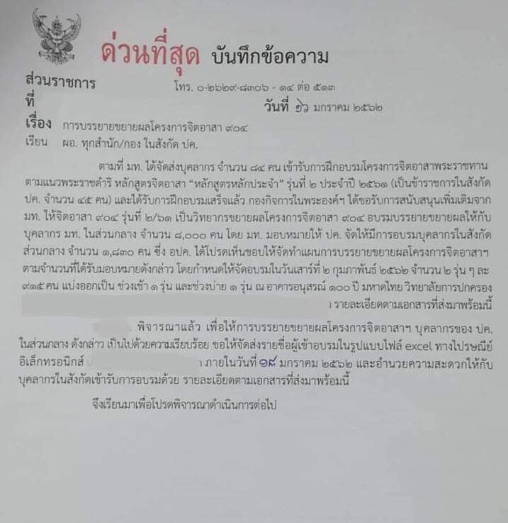 EXCLUSIVE—Leaked documents about compulsory training last weekend for 1830 government employees, who were indoctrinated with propaganda about King Vajiralongkorn’s royal volunteer force. These government workers are then expected to teach their colleagues about the movement 1/6