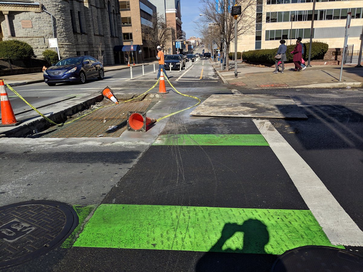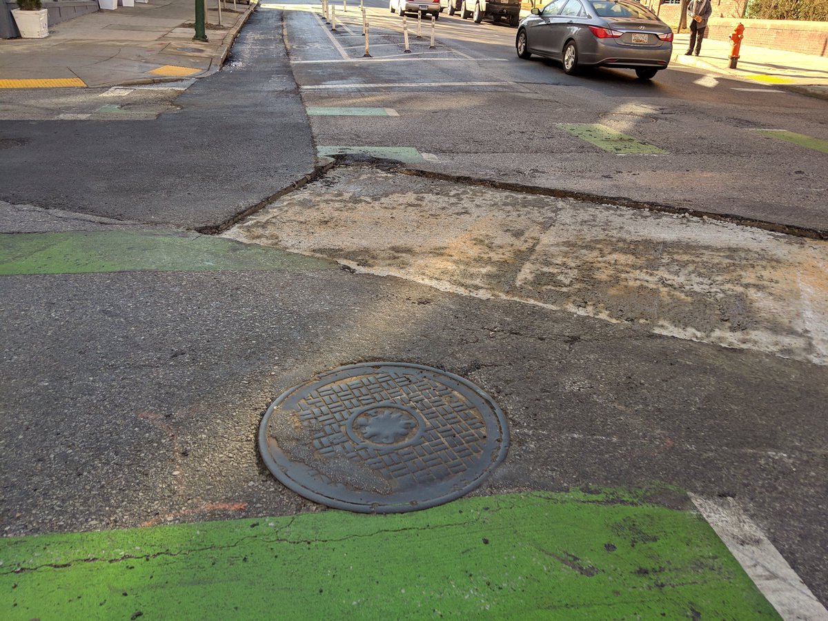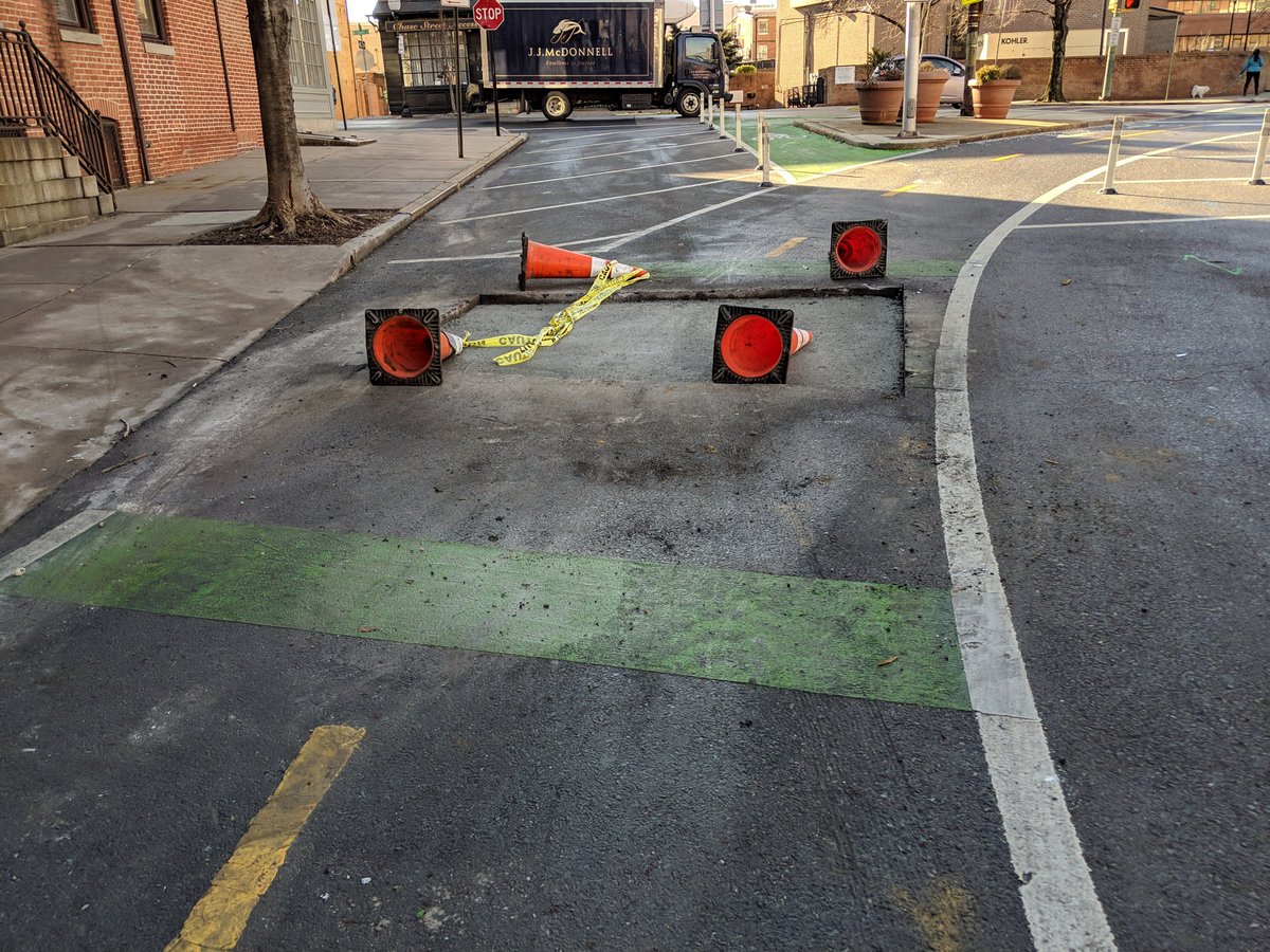 A large street cut through the Maryland cycletrack with no warning or maintenance of traffic.