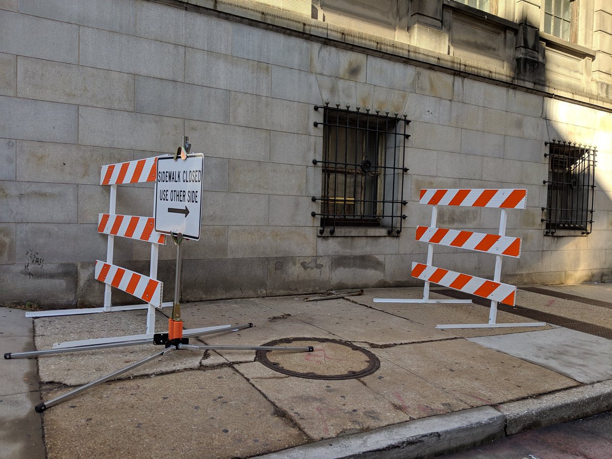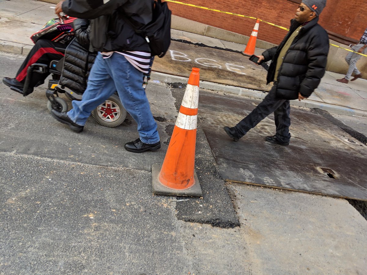 Street work with no bicycle accommodation near Mount Royal, forcing you to ride into a lane of traffic.