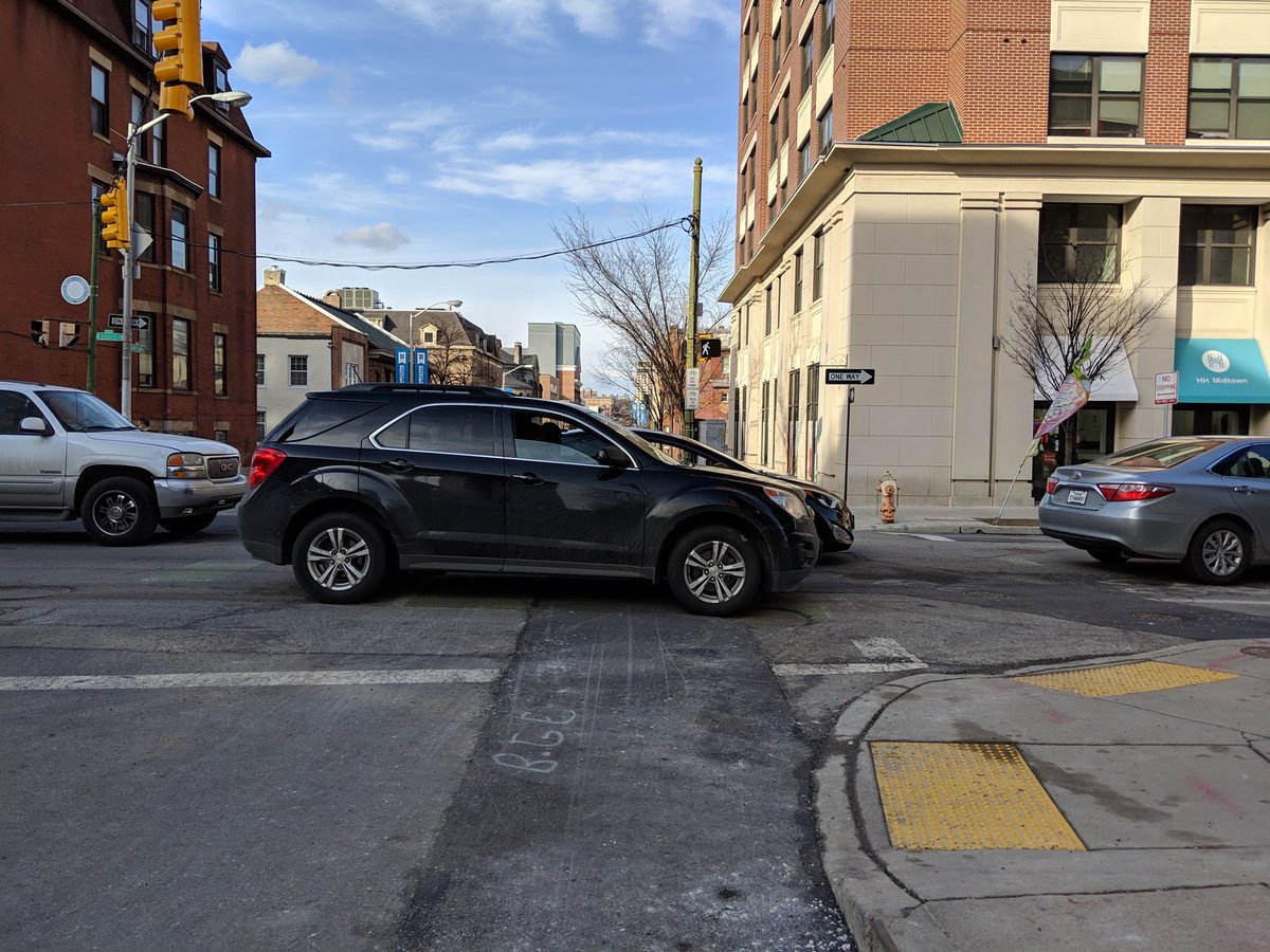 This person blocked the box on Fayette. I could bike by but the bus behind me was held up.