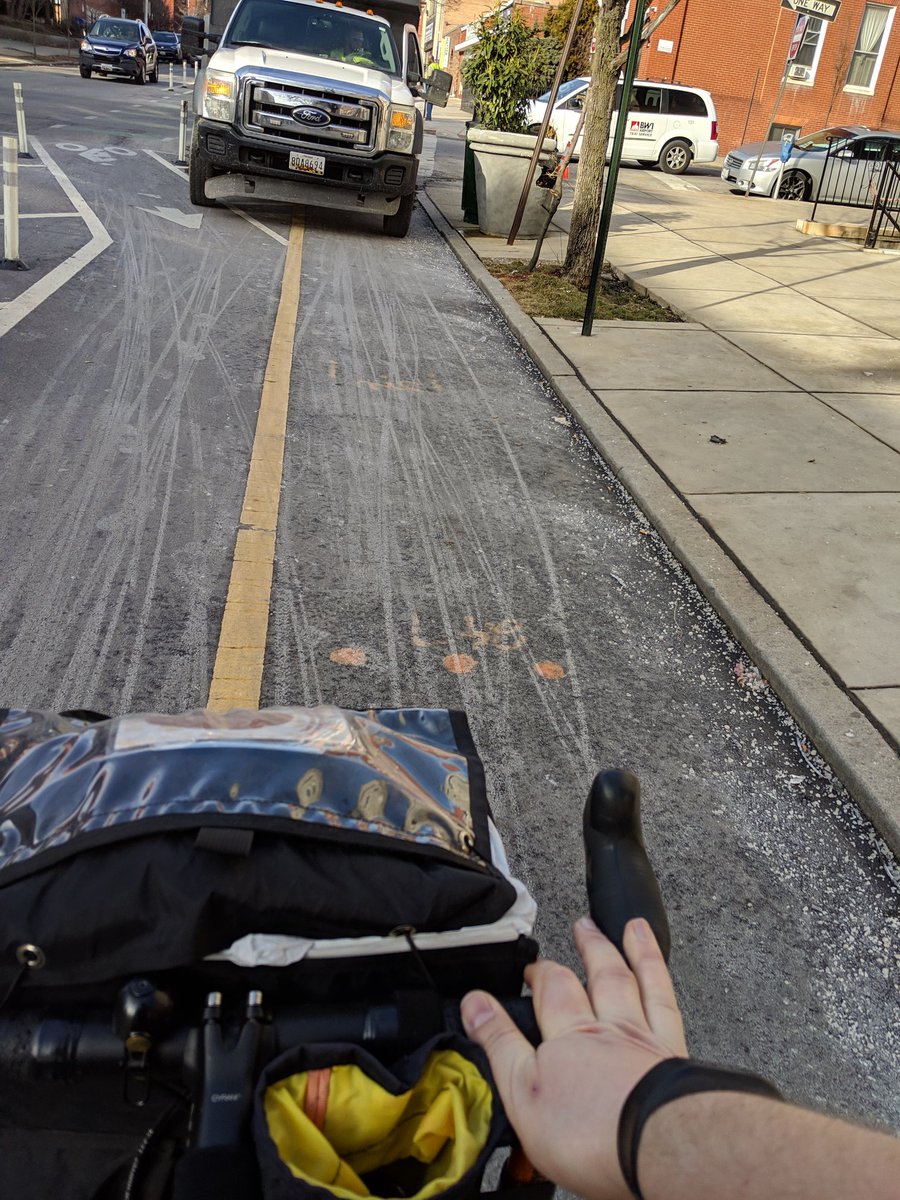 Republic Services emptying dumpsters through the Maryland cycle track instead of using the parking lot.