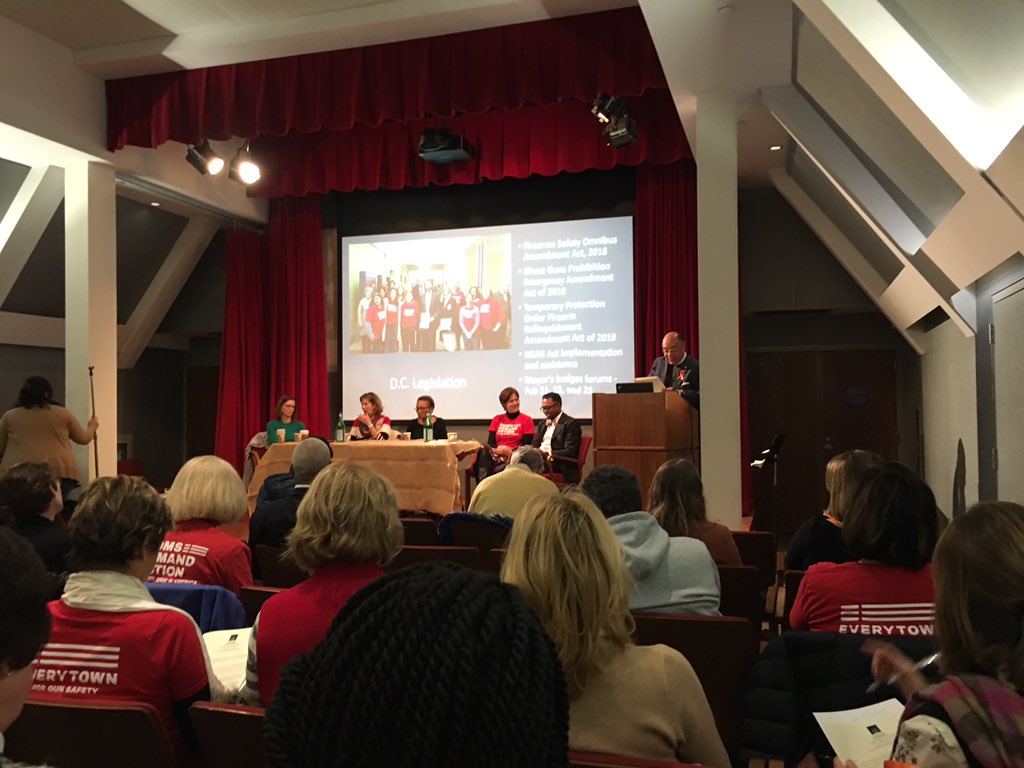 Learning about actions we can take to reduce gun violence - thanks @WNCathedral for hosting @MomsDemand @CSGV and others Panel of adults in front of a screen listing DC legislation related to gun sense