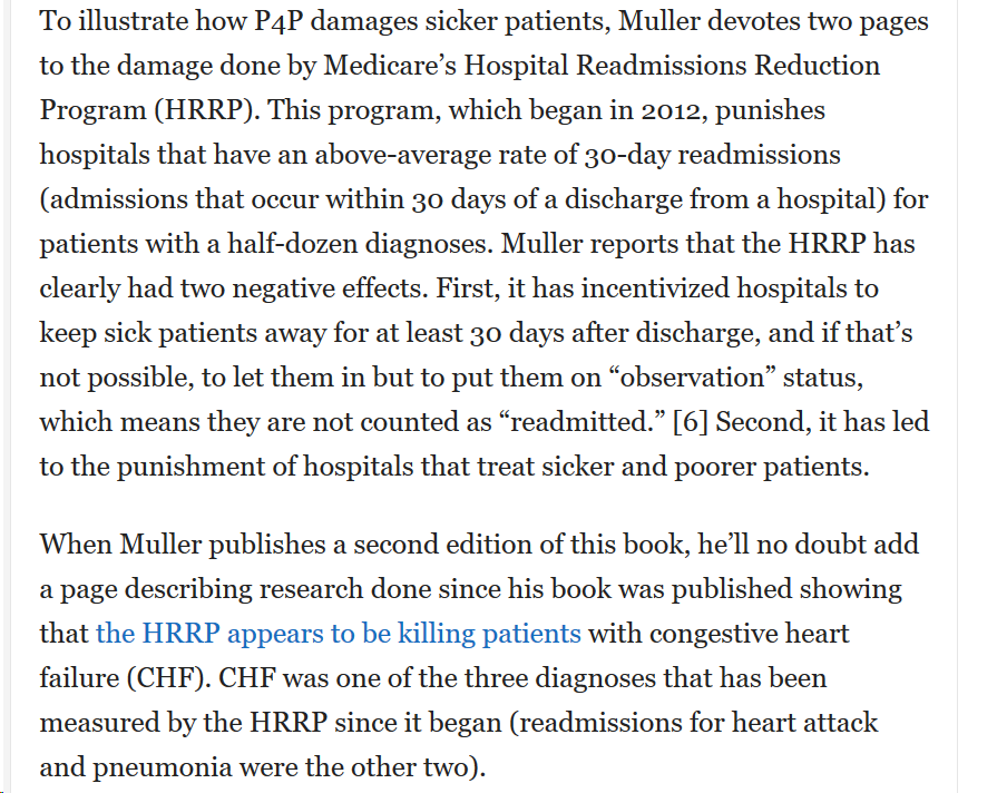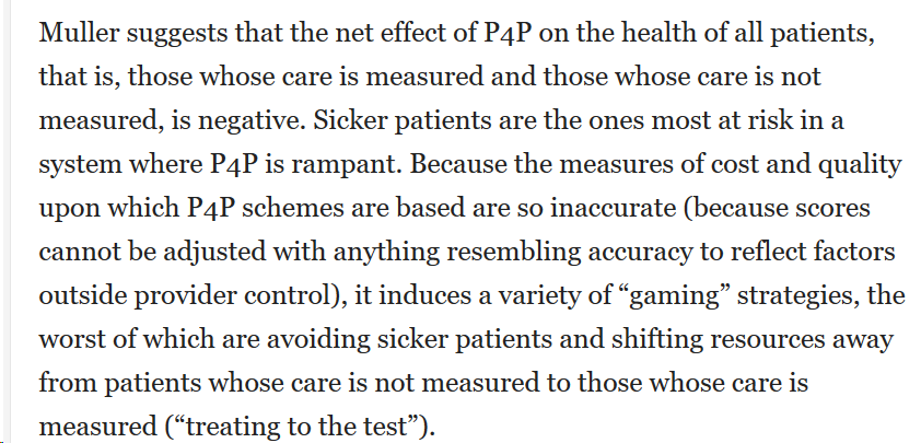 4/n Il y a eu récemment une illustration remarquable de la faillite de cette méthode aux USA avec l'échec d'un indicateur choisi aussi scientifiquement qu'arbitrairement, le taux de réadmission à 30 js des patns polypatho qui a fini par tuer plus de patnts quand appliqué.
